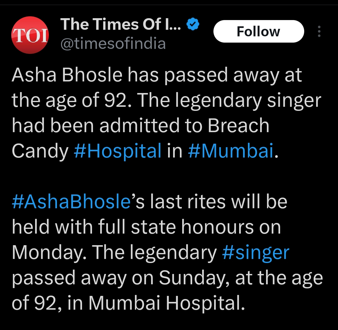 #AshaBhosle #RIPAshaBhosle #AshaBhosleDeath #BollywoodNews #MusicLegend #IndianCinema #BreakingNews #AshaTaiFinalJourney