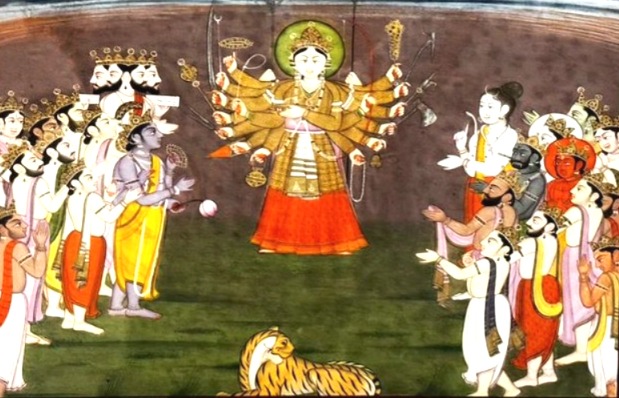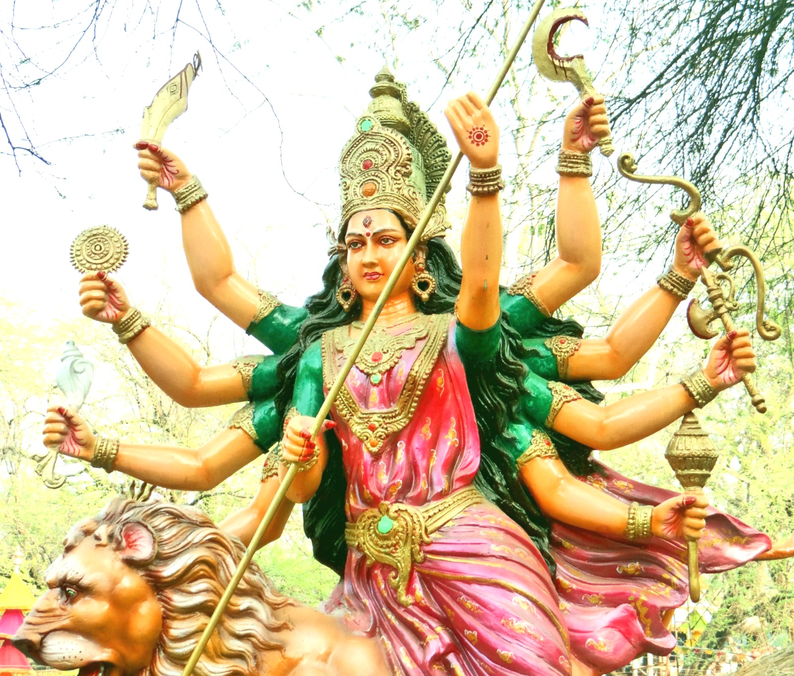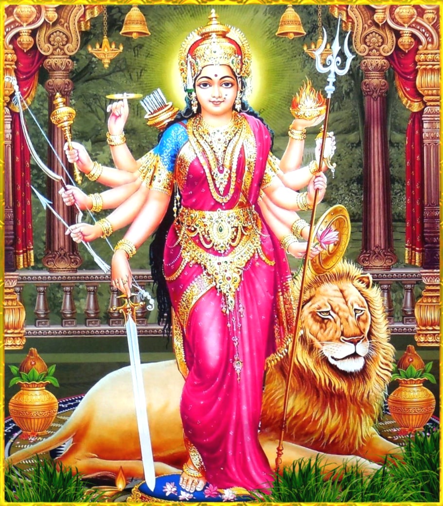 मां दुर्गा की जो प्रतिमा हम देखते हैं, उसमें वह एक सिंह पर विराजमान हैं और उनके दस हाथ हैं।
