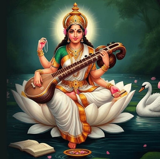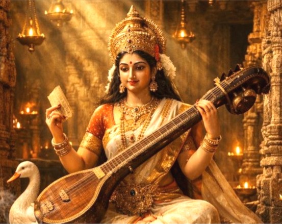 जैसे ही मां सरस्वती ने अपनी वीणा के तारों को छुआ, पूरी सृष्टि में एक दिव्य कंपन हुआ।