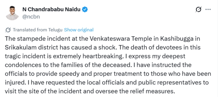 सोशल मीडिया प्लेटफॉर्म ‘एक्स’ पर एक पोस्ट में उन्होंने कहा, “श्रीकाकुलम जिले के काशीबुग्गा स्थित वेंकटेश्वर मंदिर में भगदड़ की घटना से मैं गहरा सदमे में हूँ। इस दुखद घटना में श्रद्धालुओं की मौत बेहद दुखद है। मैं मृतकों के परिवारों के प्रति अपनी गहरी संवेदना व्यक्त करता हूं।”