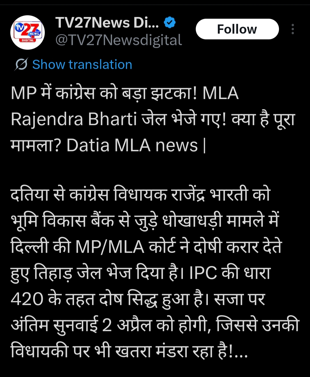 कांग्रेस के कद्दावर नेता और दतिया से वर्तमान विधायक राजेंद्र भारती को दिल्ली की एक विशेष अदालत ने 3 साल की सजा सुनाई है।
