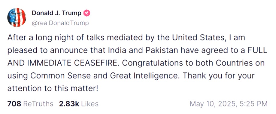 मुझे ये बताते हुए बहुत खुशी हो रही है कि भारत और पाकिस्तान तुरंत और पूरी तरह युद्धविराम के लिए राजी हो गए हैं।