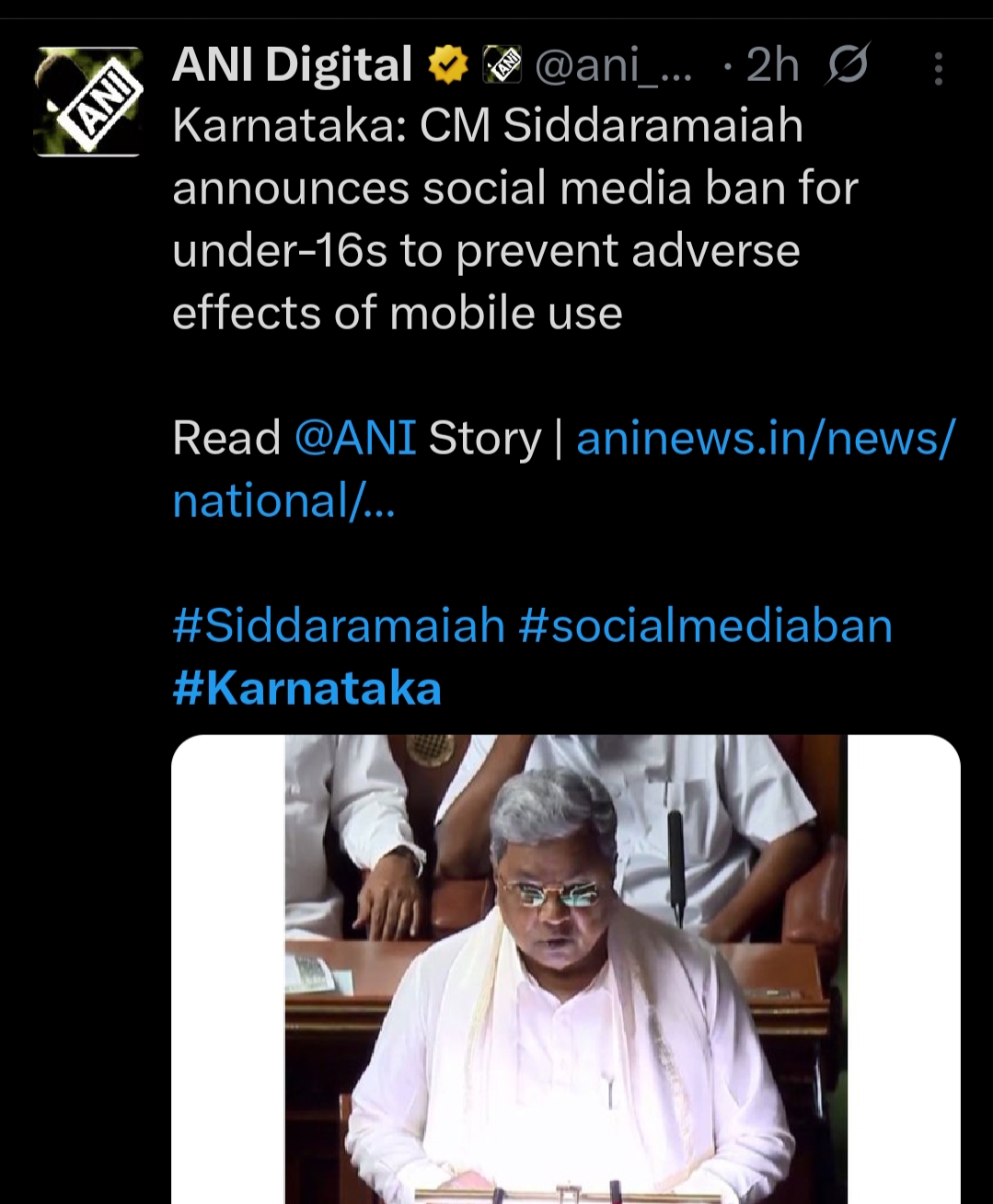शुक्रवार (6 मार्च, 2026) को विधानसभा में वित्त वर्ष 2026-27 का बजट पेश करते हुए मुख्यमंत्री सिद्धारमैया ने घोषणा की कि राज्य में 16 साल से कम उम्र के बच्चों के लिए सोशल मीडिया के इस्तेमाल पर पूरी तरह प्रतिबंध लगाया जाएगा।