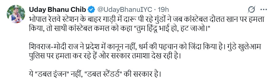 युवा कांग्रेस अध्यक्ष उदय भानु चिब ने ट्वीट कर कहा – “शिवराज-मोदी राज में कानून नहीं, धर्म की पहचान जिंदा की जा रही है।