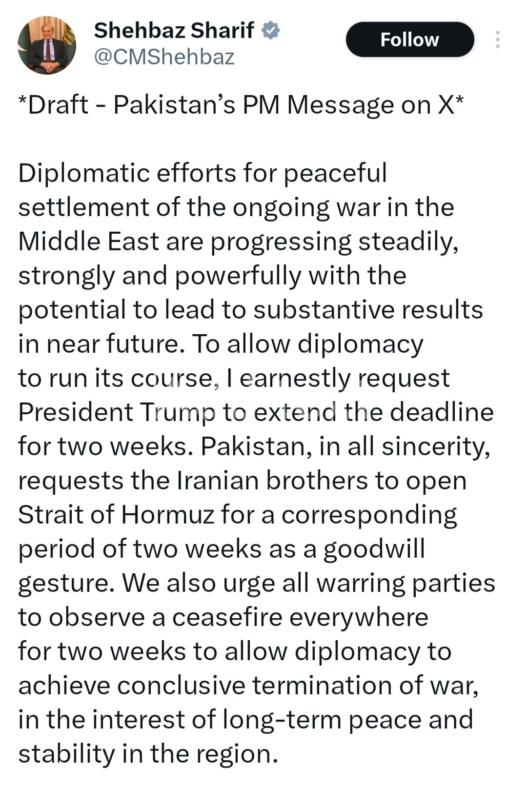 उन्होंने दावा किया कि पाकिस्तान की मध्यस्थता रंग लाई है और अमेरिका व ईरान ‘हर जगह’ तत्काल युद्धविराम के लिए राजी हो गए हैं।