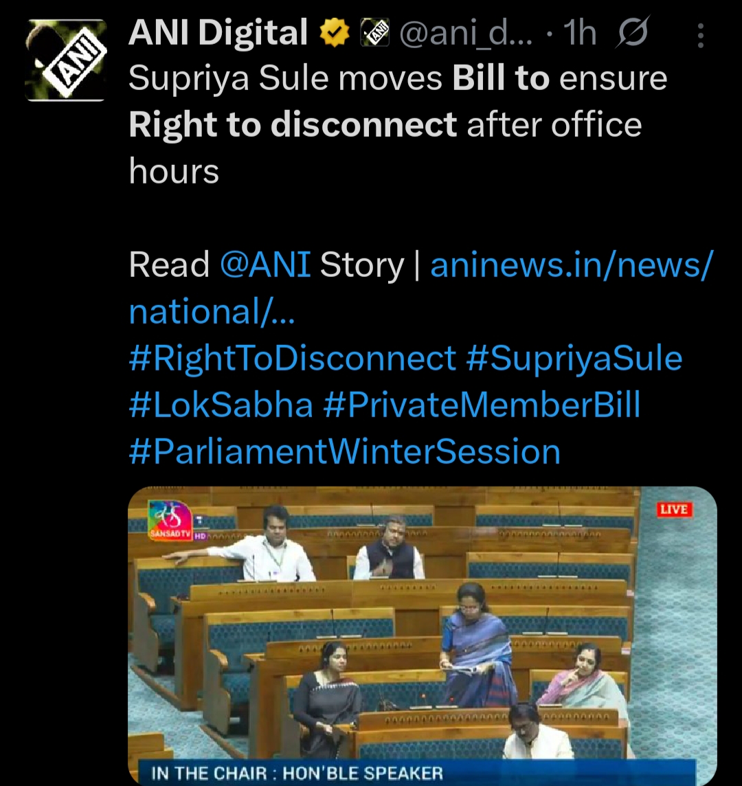 राष्ट्रवादी कांग्रेस पार्टी (NCP) की सांसद सुप्रिया सुले ने ‘राइट टू डिस्कनेक्ट बिल 2025’ संसद में पेश किया है।