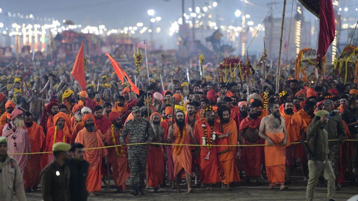 सुबह सेक्टर 18 से अपने अखाड़ों से निकलकर स्नान के लिए जाते नागा संन्यासी, नागा संन्यासियों के लिए पांटून पुल आने-जाने के लिए रिजर्व रखा गया था।