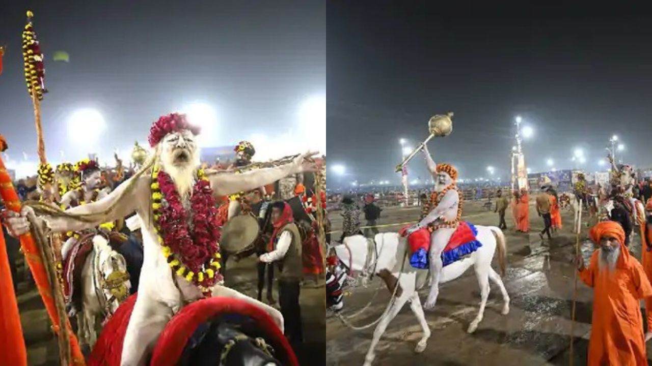 हाथों में तलवार-गदा, डमरू लिए साधु-संत अखाड़े से निकले और हर-हर महादेव का जयघोष करते हुए संगम पहुंचे।
