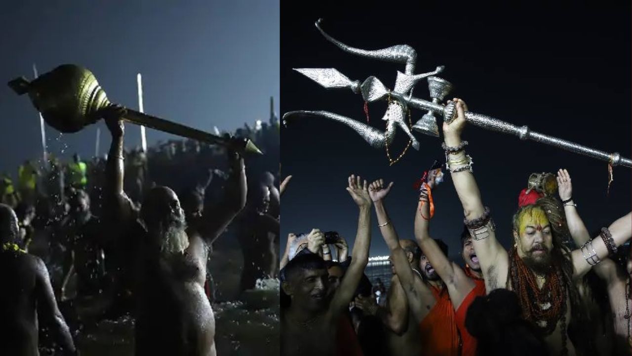 संगम में नागा संन्यासी ने गदा लहराई और डुबकी लगाई, वहीं संगम स्नान के दौरान नागा संन्यासियों ने त्रिशूल भी लहराए।